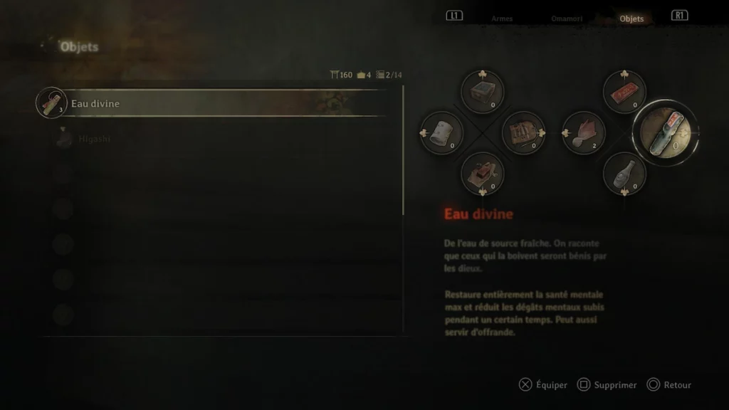 Véritable tare des jeux modernes, cet épisode f ne fait pas l’impasse sur une progression dite « light-rpg ». Vous aurez la possibilité de renforcer vitalité, stamina et santé mentale via des offrandes afin d’un peu mieux vivre les combats à venir. Ces offrandes prennent de la place dans l’inventaire, et étant donné que les combats peuvent vite tourner au game over, choisir de les prendre ou les laisser pour favoriser des objets de soin sera une décision que vous serez régulièrement amené à faire.